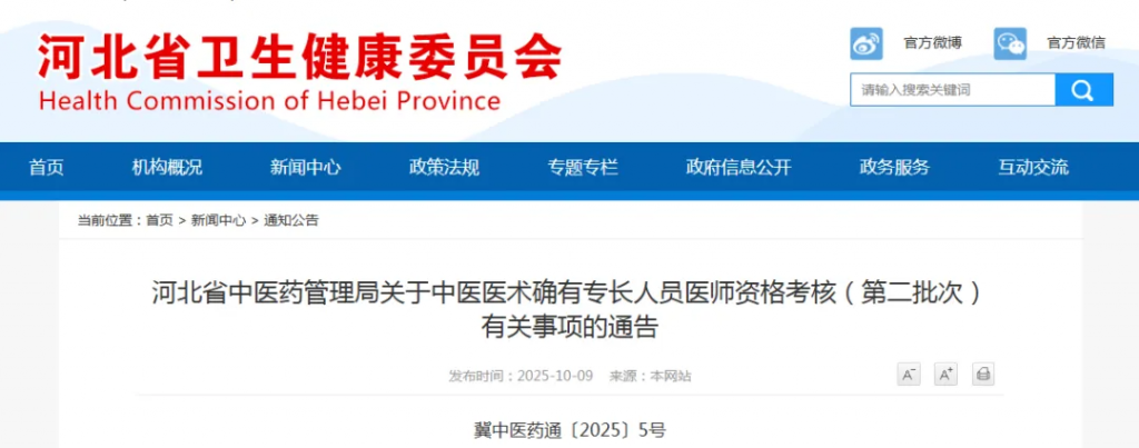 河北省中医药管理局关于中医医术确有专长人员医师资格考核(第二批次)有关事项的通告