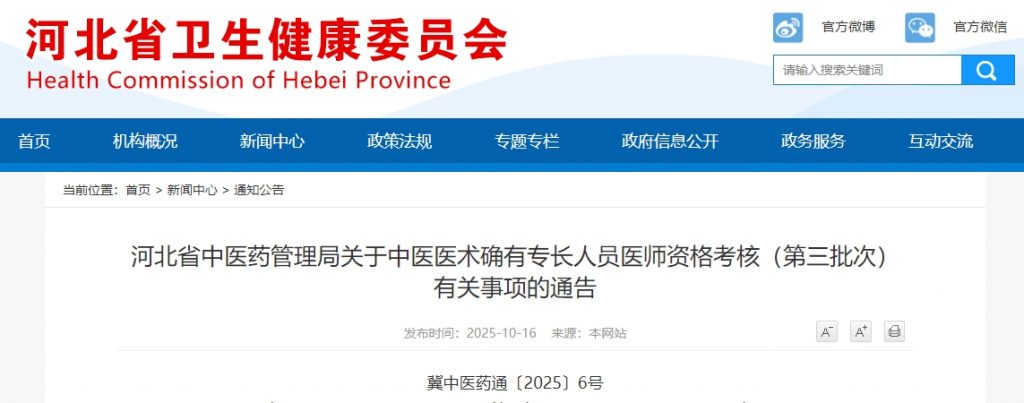 河北省中医药管理局关于中医医术确有专长人员医师资格考核(第三批次)有关事项的通告