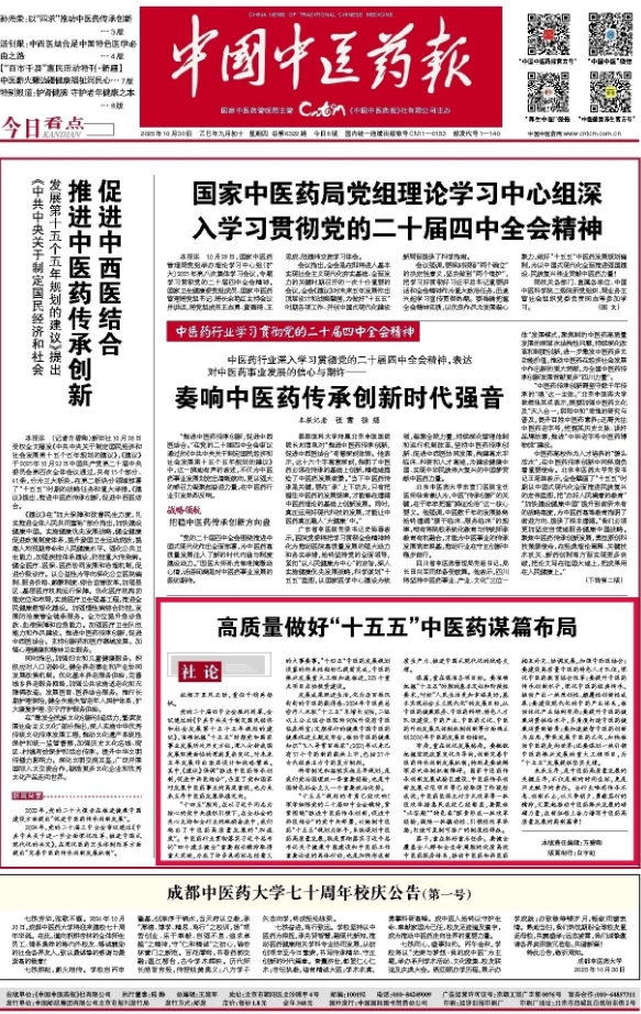 党的二十届四中全会胜利闭幕,会议通过的《中共中央关于制定国民经济和社会发展第十五个五年规划的建议》,准确把握“十五五”时期党和国家事业发展所处历史方位,深入分析我国发展环境面临的深刻复杂变化,对未来五年发展作出顶层设计和战略擘画。其中,《建议》强调“推进中医药传承创新,促进中西医结合”,凸显了党和国家对发展中医药事业的高度重视,也为未来五年中医药发展举旗定向。
