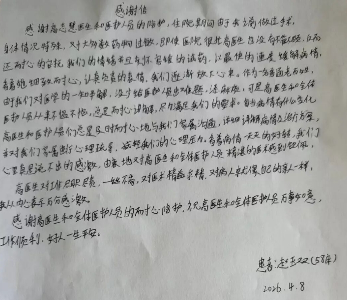 一封感谢信,满纸医患情——滦南县中医院脑病脾胃科高志慧医生